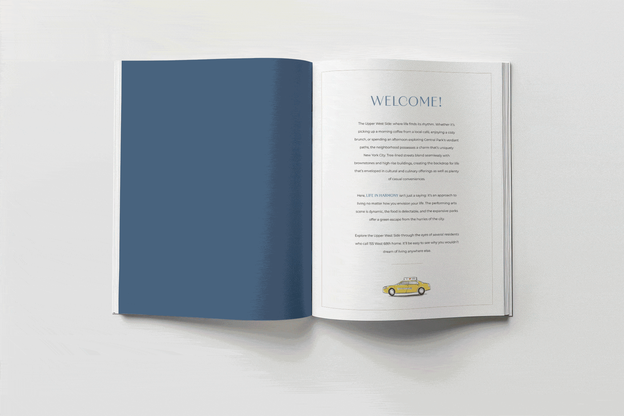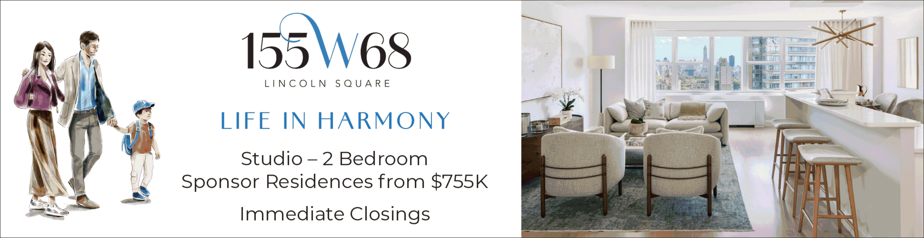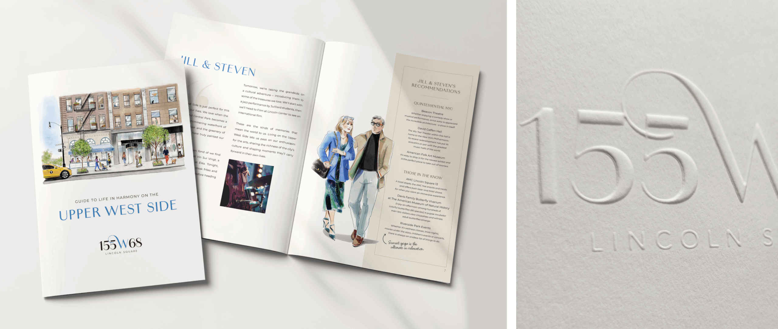 To address both challenges, we renamed the property 155 West 68th Street to clearly distinguish the condo units from the rental inventory, while also emphasizing its prime amenity – the Upper West Side location. We designed a logo and tagline, “Life In Harmony,” celebrating the neighborhood’s cultural attractions, including Lincoln Center. The campaign featured custom illustrations of residents enjoying life at 155 West 68th Street, alongside local highlights such as Central Park, Riverside Park, popular bagel spots, and cultural venues.  A comprehensive neighborhood guide, available in both print and digital formats, further reinforces the building’s connection to its vibrant surroundings.